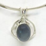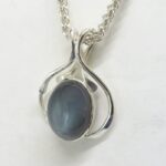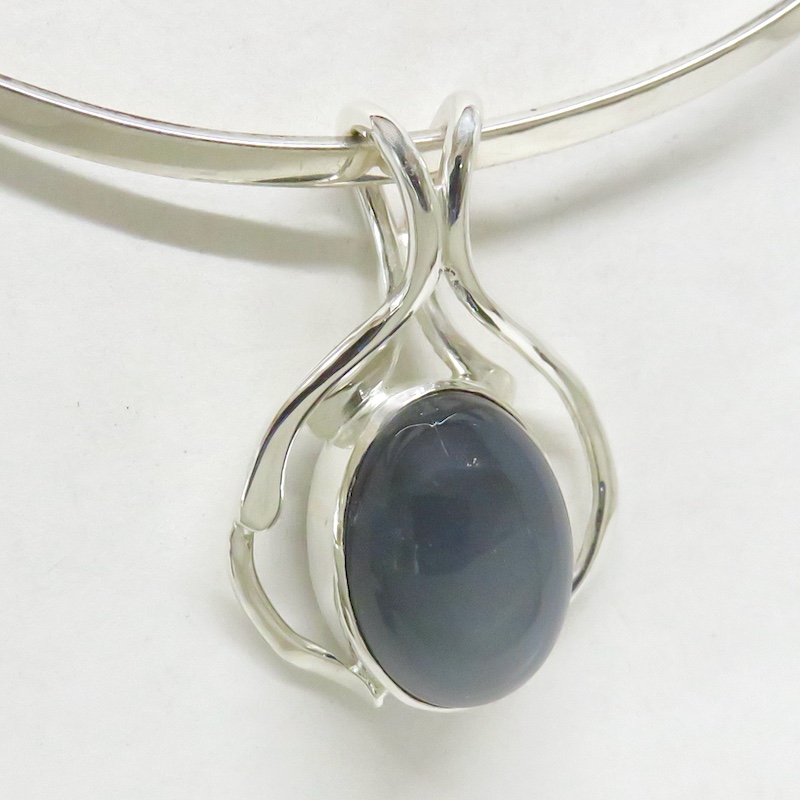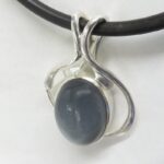 A black Moonstone in a sterling silver pendant Is a rare jewel indeed. I’m not sure I have ever seen one, other than this one, before.Have you? The hand fabricated sterling silver pendant is Art Nouveau inspired and it has the look of vines that are grasping the stones bezel setting. They call this color black in the trade. But actually it’s a dark grey with the adularescence giving it a silvery almost mysterious quality. This Black Moonstone gem is an inch in length making for a dramatic look. Go ahead give it a try. This pendant will surely add to your mystique.
