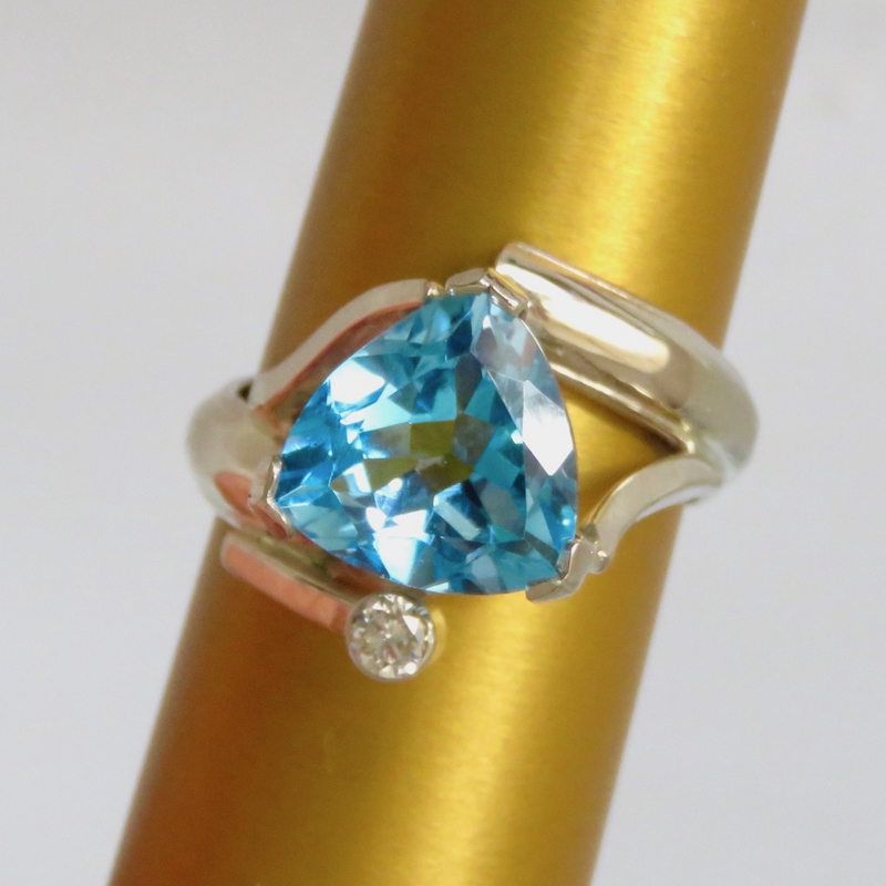Yes, a Blue Topaz in our favorite Arches Criss-Cross design ring. If you already have a green or purple Arches ring, you will definitely need a blue one. This is one of our most sought-after ring designs. The 18K white gold is the perfect foil for the vibrant blue of the Topaz. I made this with a slightly larger center stone than some of its predecessors. It is something that you might wear on a center finger or a ring finger. This ring makes a great dress ring as well as a more dramatic everyday fashion ring.