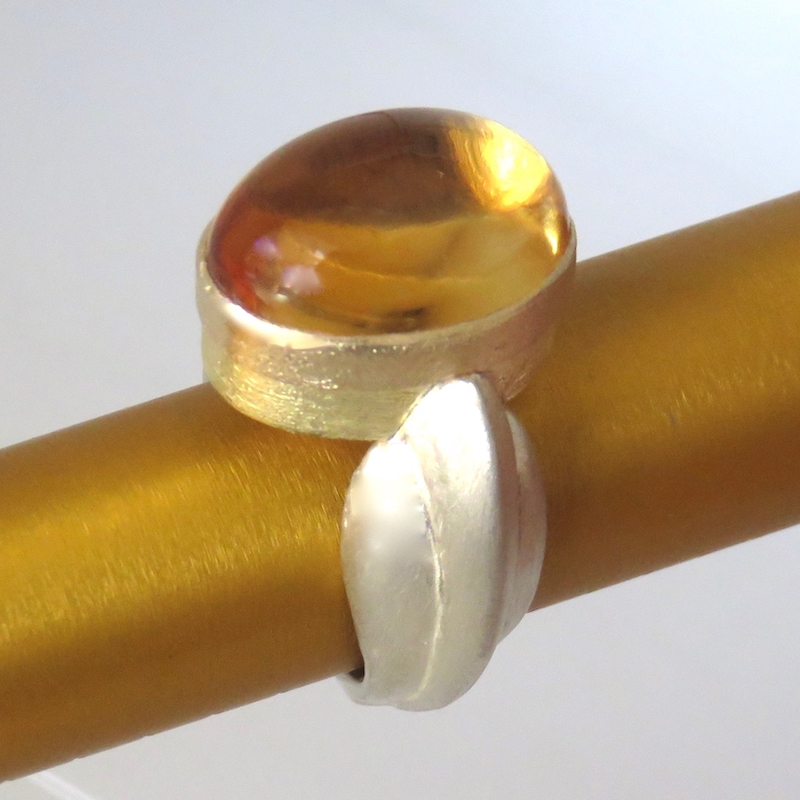Citrine believe it or not, is difficult to find in a pretty cabochon.  This stunning ring is large and has details that display its hand craftsmanship to all.  The mix of silver, rose gold and yellow gold are highlighted by the satin finish.  You will see a sun-like golden yellow every time you look at your hand.