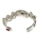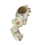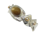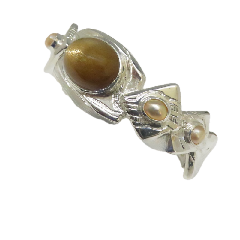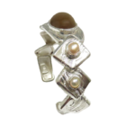 This is a Golden Moonstone and Pearl cuff bracelet that as you see is a jewel of fantasy and fun. What you see is a cuff style bracelet that was made to delight you and I. The geometric layerd sections circle the wrist, each section is etched, with bezel set pearls on four of them. On the back of the bracelet is a “secret Citrine” set so only you know it’s there. The rare Golden Moonstone has long been in my collection of Moonstones. It has a distinct cat’s eye has been positioned to go across the stone rather than in the traditional length wise position. The Golden Moonstone is approximately 3/4” long with a high dome cut to the cabochon. The cultured baroque pearl’s have rich and unusual natural colors not seem too often . A very eclectic mix of elements that make for a visual delight. As part of my Layer’s series it makes a strong statement. When you put this on doubt you will feel like “ Seizing the day!”