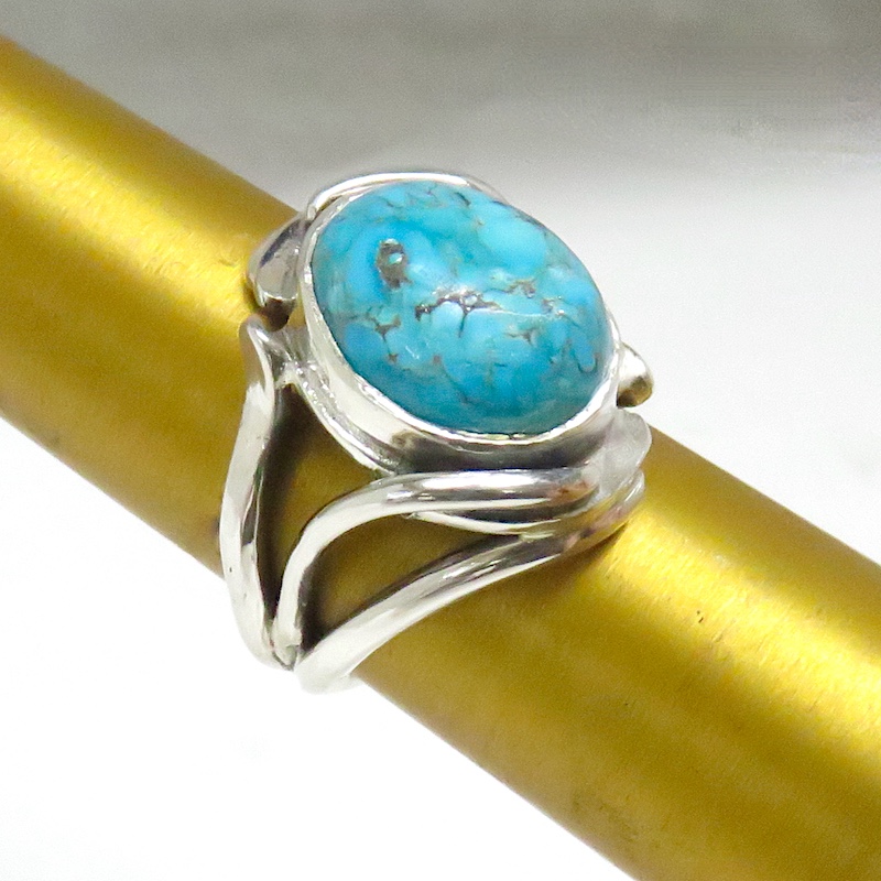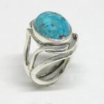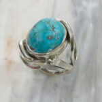 This Turquoise sterling silver Art Nouveau design ring will captivate you. When you see so much Turquoise in traditional looking rings  it’s refreshing to see it in a different look. A ring styled  like this could have dressed the hand of a woman from the Belle Epoch to the Modern day. We all know Turquoise never goes out of style. If you don’t believe me you can just ask Cleopatra. The Morenci Arizona Turquoise is so blue and has a  the matrix that always adds to it’s character. I even cut this stone myself from rough in I  bought in the 70’s! This could be your first Turquoise ring or your new favorite in your collection.